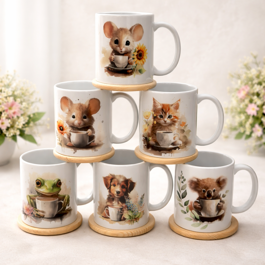 Weitere Tassen aus der Serie «Tierisches Guten Morgen» sind: Katze mit Butterblume, Koala mit Eukalyptus, herzige Sonnenblumen Maus, Frosch mit Seerose oder die süsse Mohn Maus