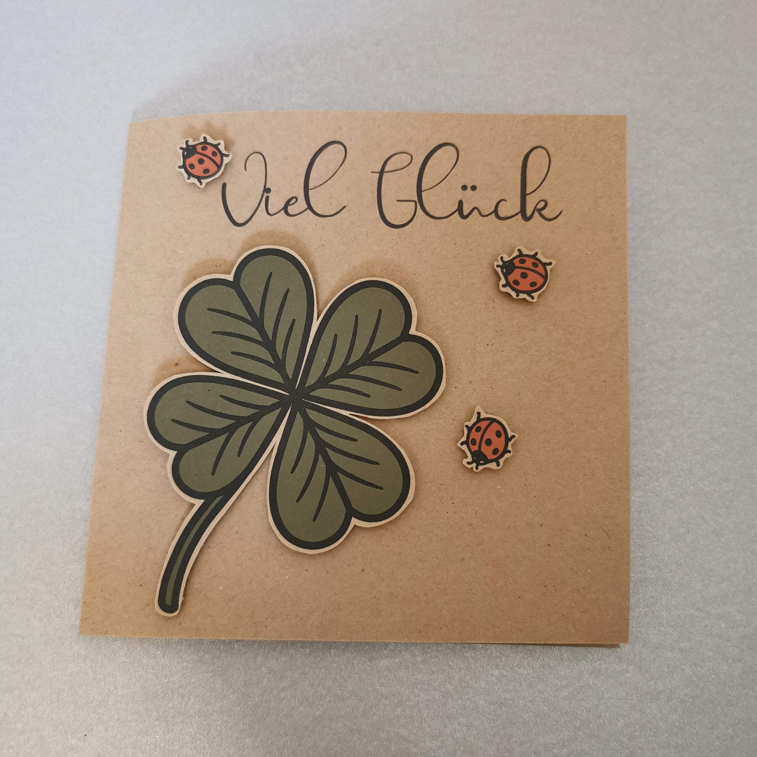 Die handgefertigte Karte «viel Glück» mit den bunten Glücksbringern für einen lieben Menschen, der etwas Glück braucht: