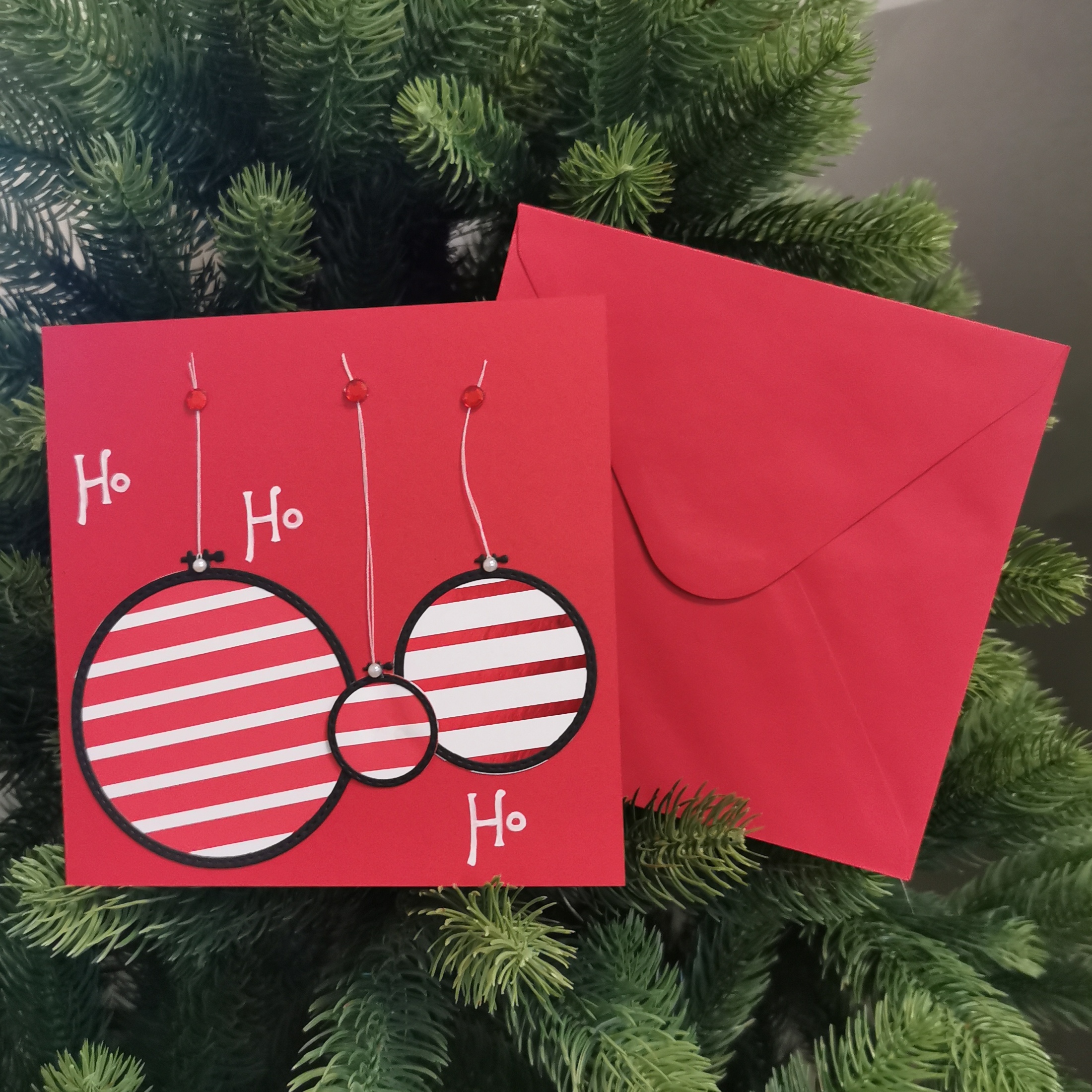 Die handgemachte Weihnachtskarte «Ho Ho Ho – die Weihnachtskugeln» – perfekt für deine besten Wünsche zu Weihnachten: