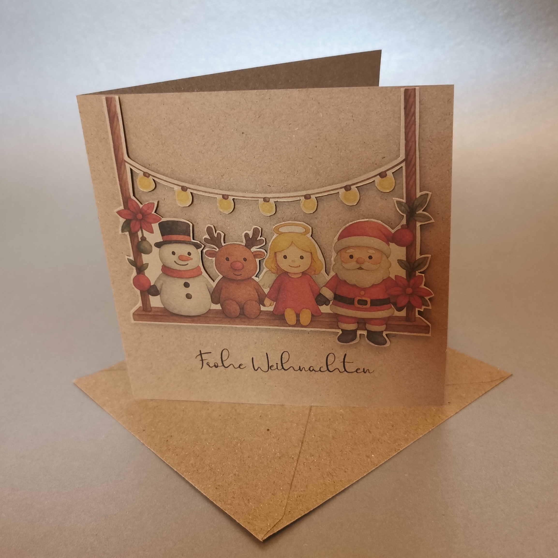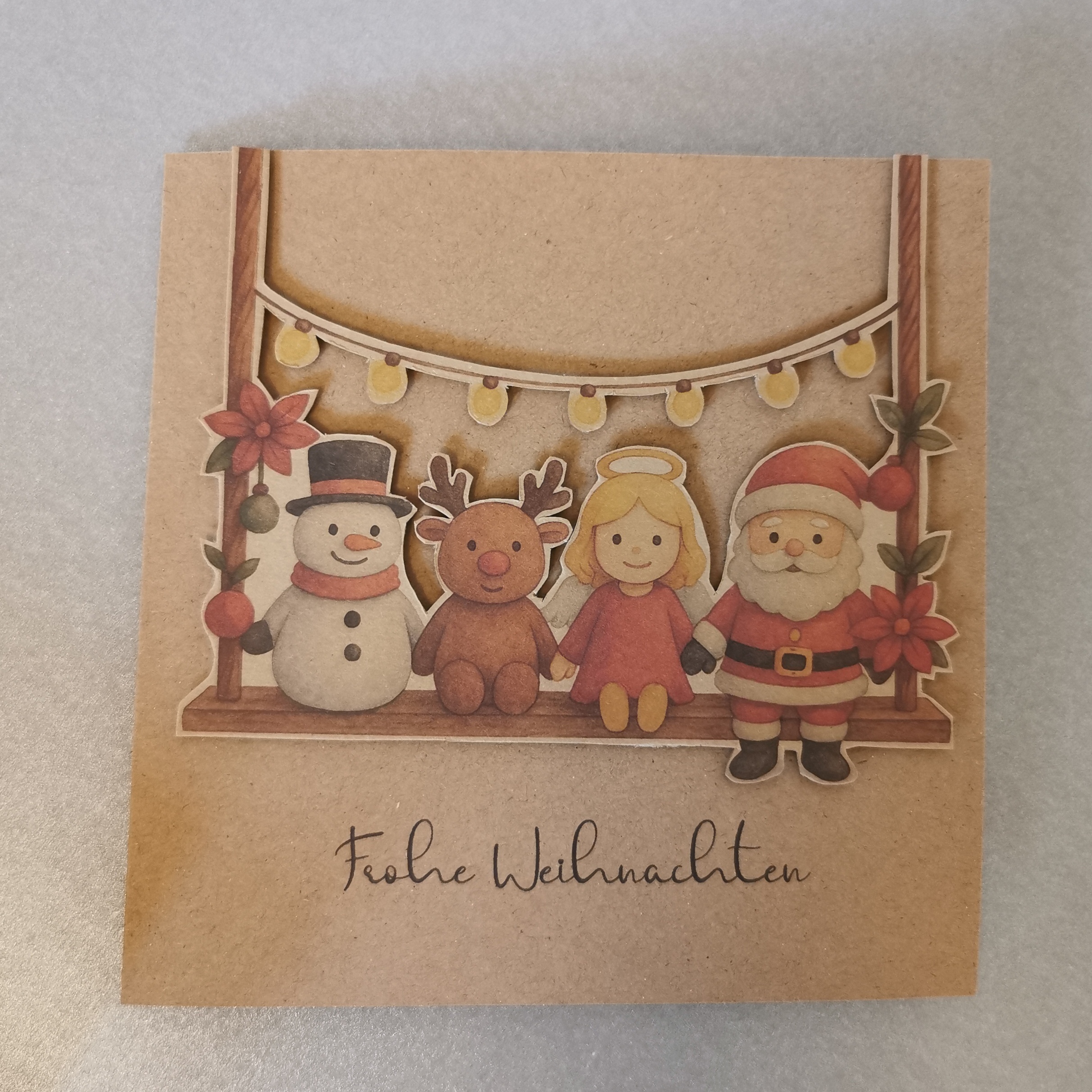 Die handgemachte Weihnachtskarte «Weihnachtsschaukel» – perfekt für deine besten Wünsche zu Weihnachten. Die süssen Weihnachtsfiguren: Schneemann, Rentier, Christchind und der Samichlaus wünschen Frohe Weihnachten.