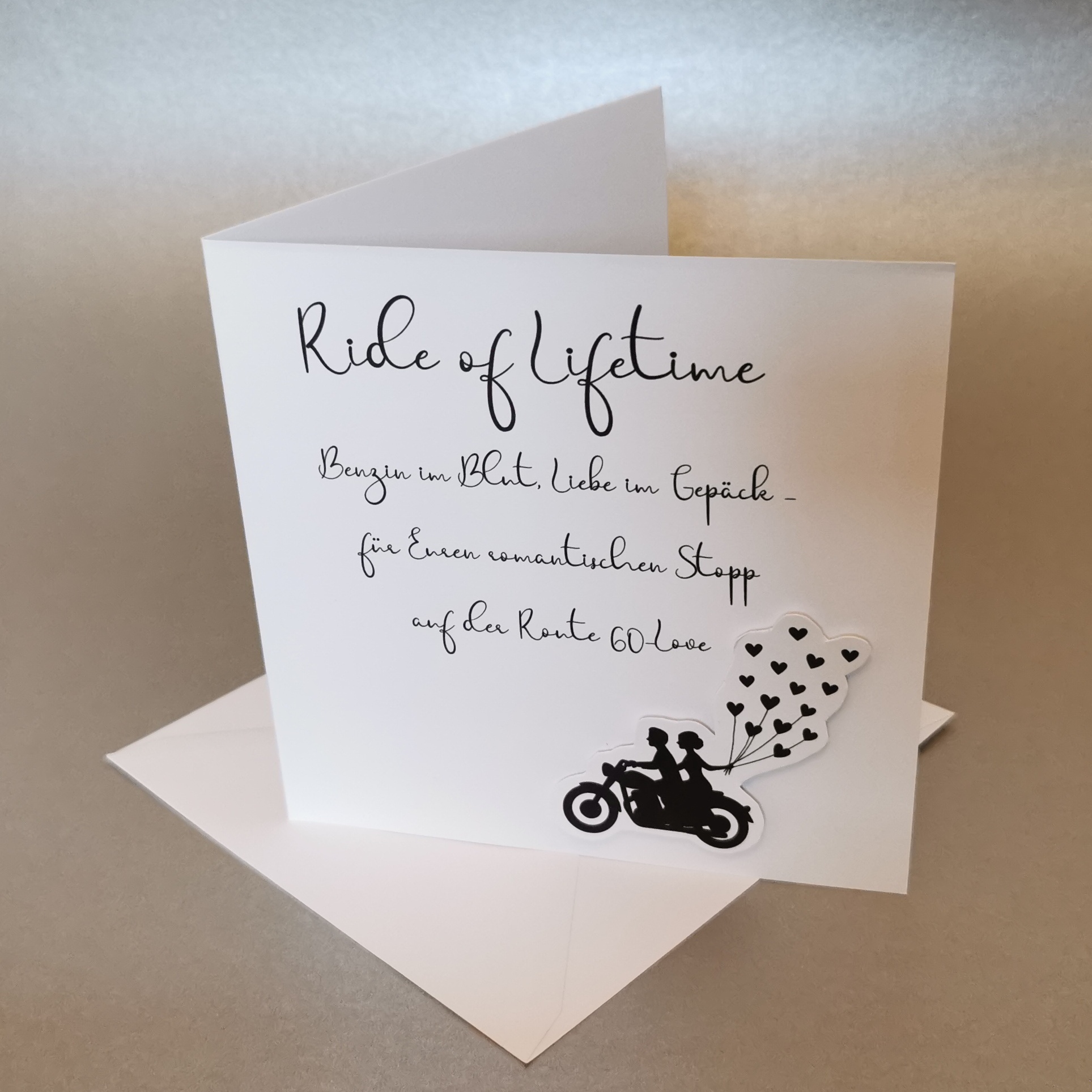 Die handgefertigte Hochzeitskarte «Ride of Lifetime» für alle frisch verheiratenden Motorrad Fans