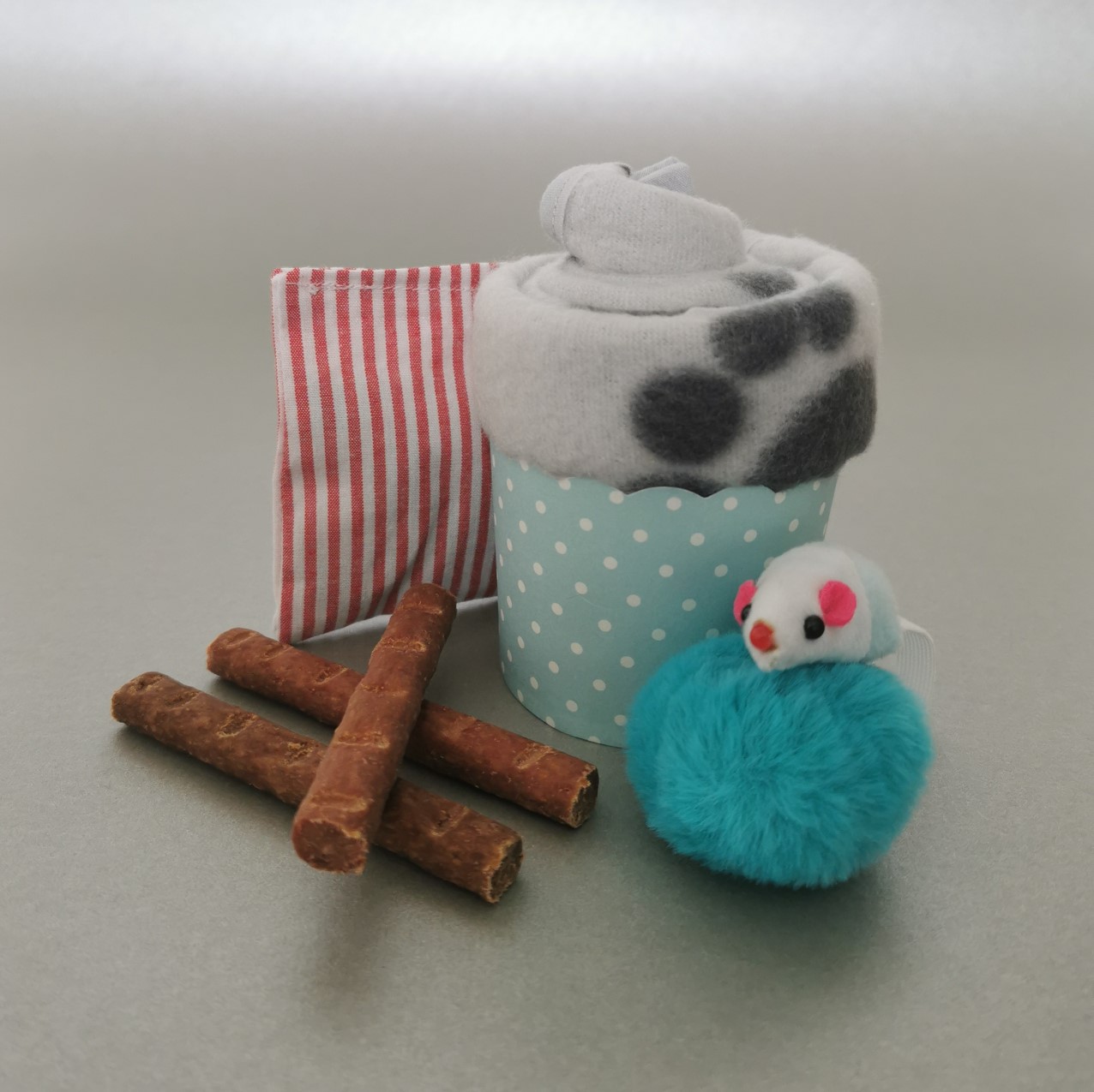 Als grosse Katzenliebhaberin und langjährige Besitzerin versteht auch Bringsel, wie wichtig Katzen in unserem Leben sein können. Darum gibt es den besonderen Miau Bringsel hier im Shop. Jedes Miau Bringsel wird als besonderes Geschenk für die Katze in Handarbeit her-/zusammengestellt und als Cupcake drapiert. Die flauschige Fleece Katzendecke in grau ist selbst-genäht und lädt ihre Samtpfote für ausgiebige Schläfchen ein. Der Spielball oder das Spielmäuschen lieben Katzen, aber vor allem das mit Baldrian gefüllte Schmusekissen verzaubert jede Katze. Im Sinne von KLEIN, KOMPAKT, SCHÖN VERPACKT ist das Set in einer kleinen Box verpackt.